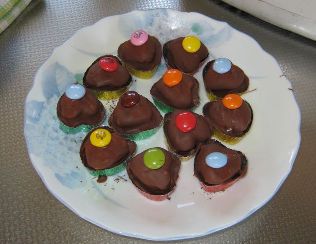ハート型にしたチョコにマーブルチョコを乗せてカラフルなものにするというので、